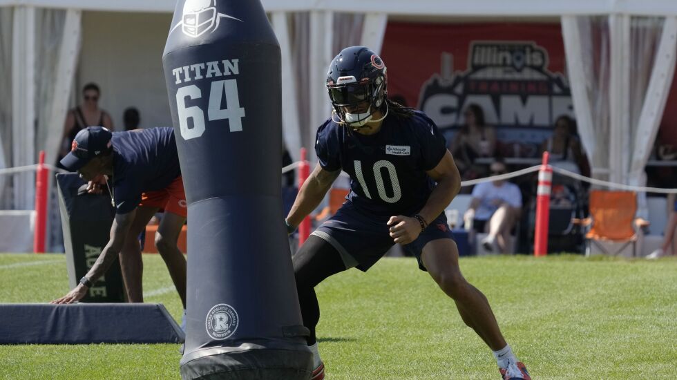 Bears receiver Chase Claypool and linebacker T.J. Edwards had been jawing at each other during Wednesday’s training camp practice when the Bears ran a toss play to Velus Jones.