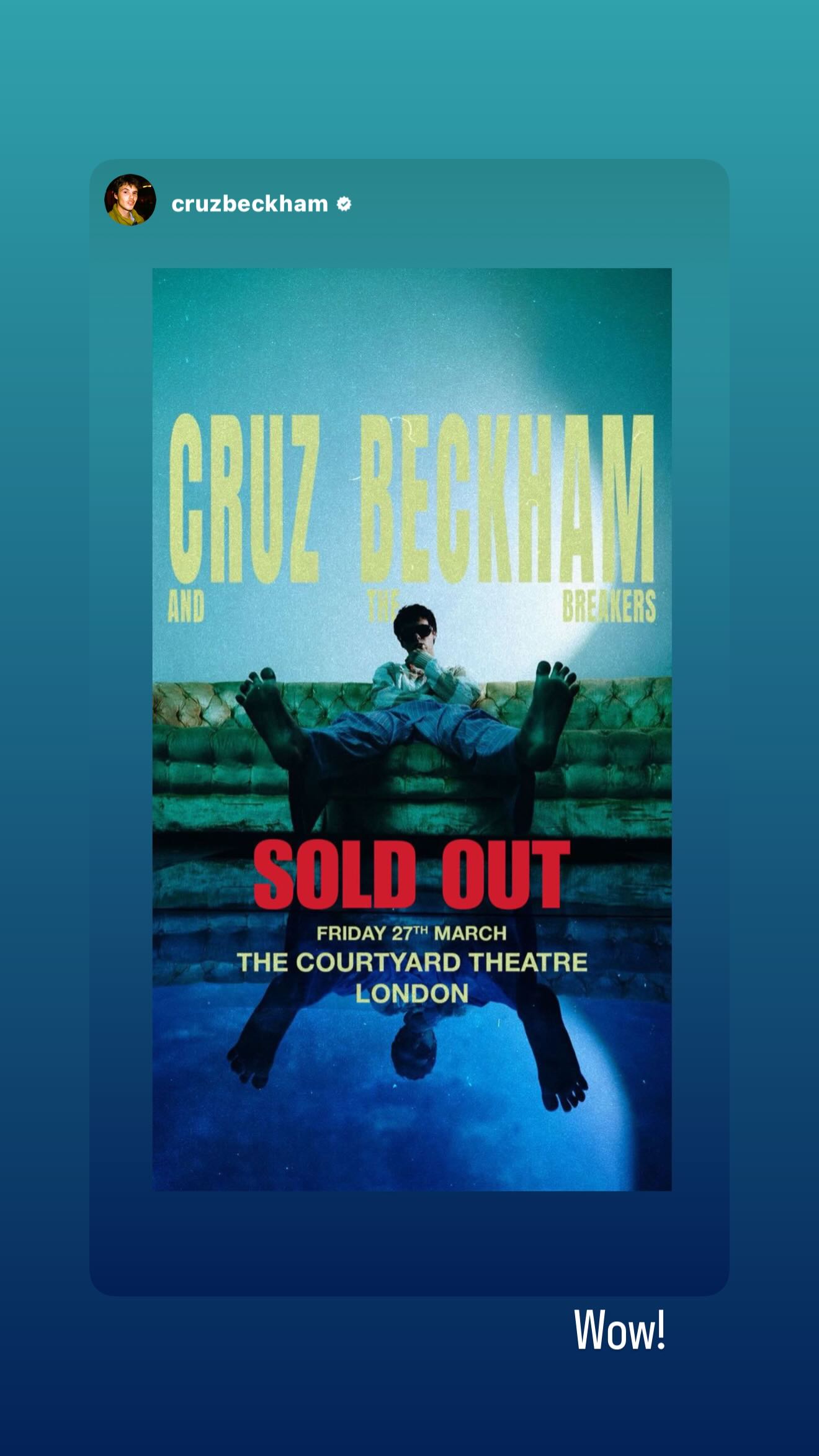Wednesday 21 January 2026 13:57 , Tom MurrayOn Wednesday morning, Victoria reshared a post from her youngest son, Cruz, announcing that his band, Cruz Beckham and the Breakers, had sold out their forthcoming gig at The Courtyard Theatre in London.