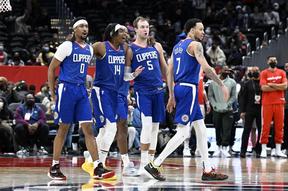 WASHINGTON, DC - JANUARY 25: (L-R) Jay Scrubb #0, Terance Mann #14, Luke Kennard #5 and Amir Coffey #7of the LA Clippers celebrate after tying the game 115-115 in the fourth quarter of their game against the Washington Wizards at Capital One Arena on January 25, 2022 in Washington, DC. NOTE TO USER: User expressly acknowledges and agrees that, by downloading and or using this photograph, User is consenting to the terms and conditions of the Getty Images License Agreement. (Photo by G Fiume/Getty Images) Getty Images