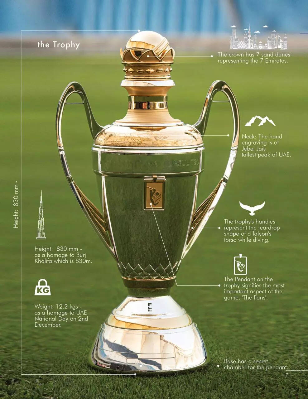 Standing at 830mm, it is a homage to the 830m tall Burj Khalifa. It weighs 12.2kgs, in respect of the UAE's National Day which falls on 2 December. The crown has seven sand dunes, representing the seven Emirates. On the neck is a hand engraving of Jebel Jais, the tallest peak in the UAE. The trophy handles symbolise the teardrop shape of a falcon's (the national bird) torso as it descends to catch its prey. The pendant on the trophy acknowledges the fans. And, finally, at the base is a secret chamber for the pendant - which is opened at the conclusion of the tournament by the winning team's owner.