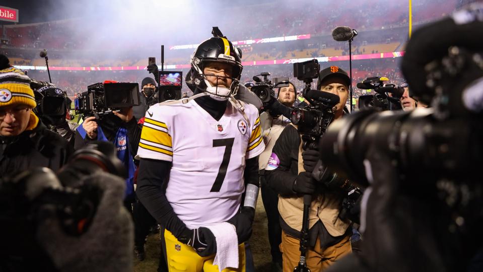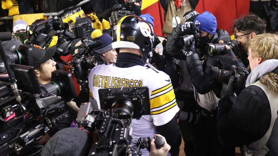 Pittsburgh Steelers quarterback Ben Roethlisberger is surrounded by the media as he walks off the field after an AFC wild card playoff game between the Pittsburgh Steelers and Kansas City Chiefs on Jan 16, 2022 at GEHA Field at Arrowhead Stadium in Kansas City, MO. (Photo by Scott Winters) Icon Sportswire via Getty Images