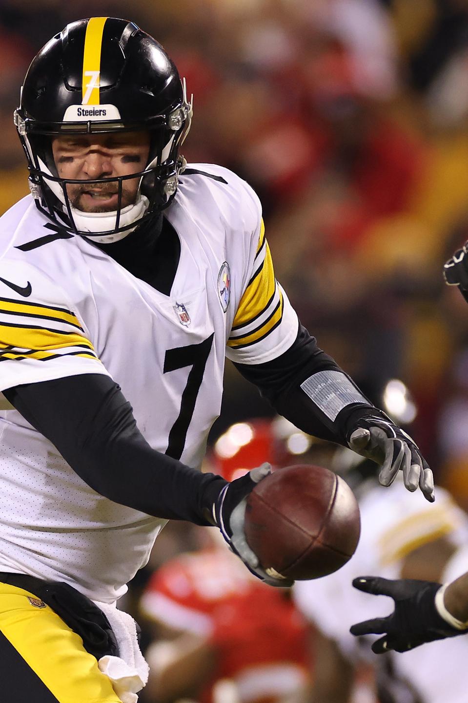 Ben Roethlisberger #7 of the Pittsburgh Steelers hands the ball to teammate Benny Snell #24 in the fourth quarter in the NFC Wild Card Playoff game at Arrowhead Stadium on January 16, 2022 in Kansas City, Missouri. (Photo by David Eulitt) Getty Images