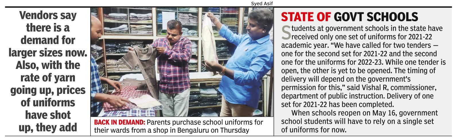 BENGALURU: With schools set to reopen in June, the uniform business has got a new lease of life. Vendors say children walking in for new uniforms have grown substantially over the last couple of years, when schooling went online.