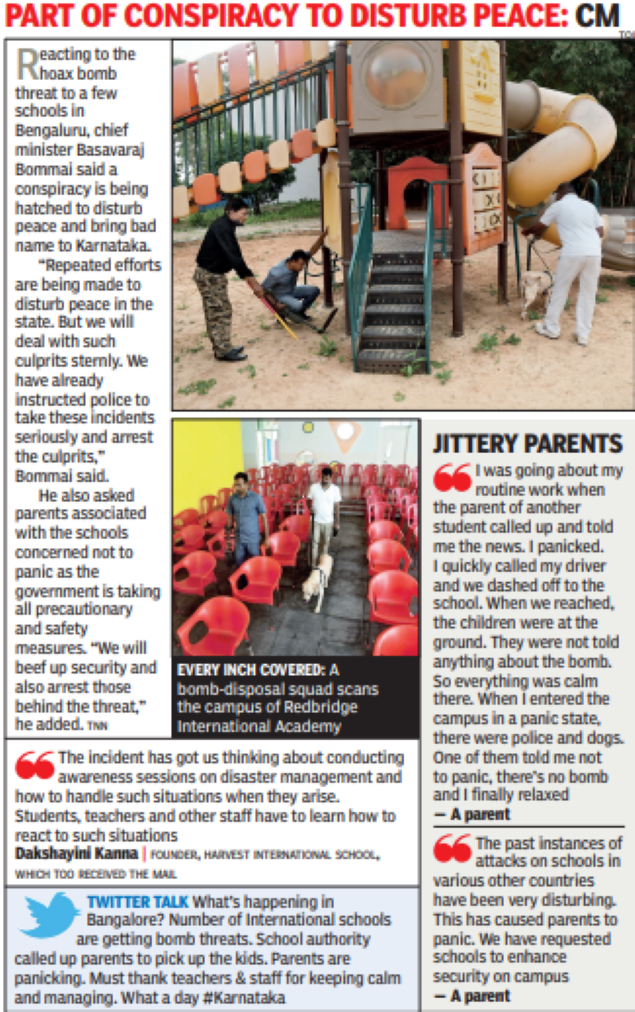 "The quick and mature reaction of schools which received the hoax bomb threat is commendable. As it is, stress levels are high among students and parents emerging from two years of pandemic scares and scars. Now, it’s for police to get to the source of this nefarious act at the earliest and bring the culprits to book. If there is a conspiracy, as suggested by the chief minister, investigators have to double their efforts, failing which miscreants will only feel emboldened. Chasing digital footprints of the mail will need expertise, but there should be no room for laxity or delay in this. After all, children were the targets, even if the mail turned out to be a hoax.-Timesview"
