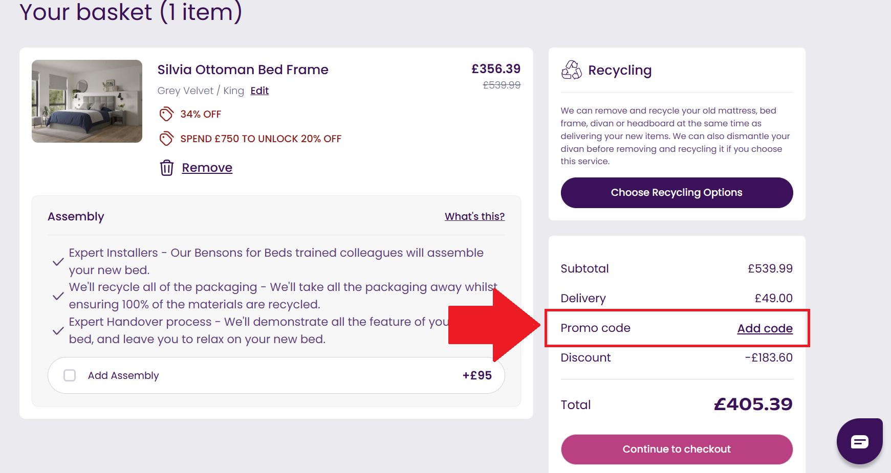 - Enter your Benson for Beds discount code in the pop-up box and hit ‘Apply’.