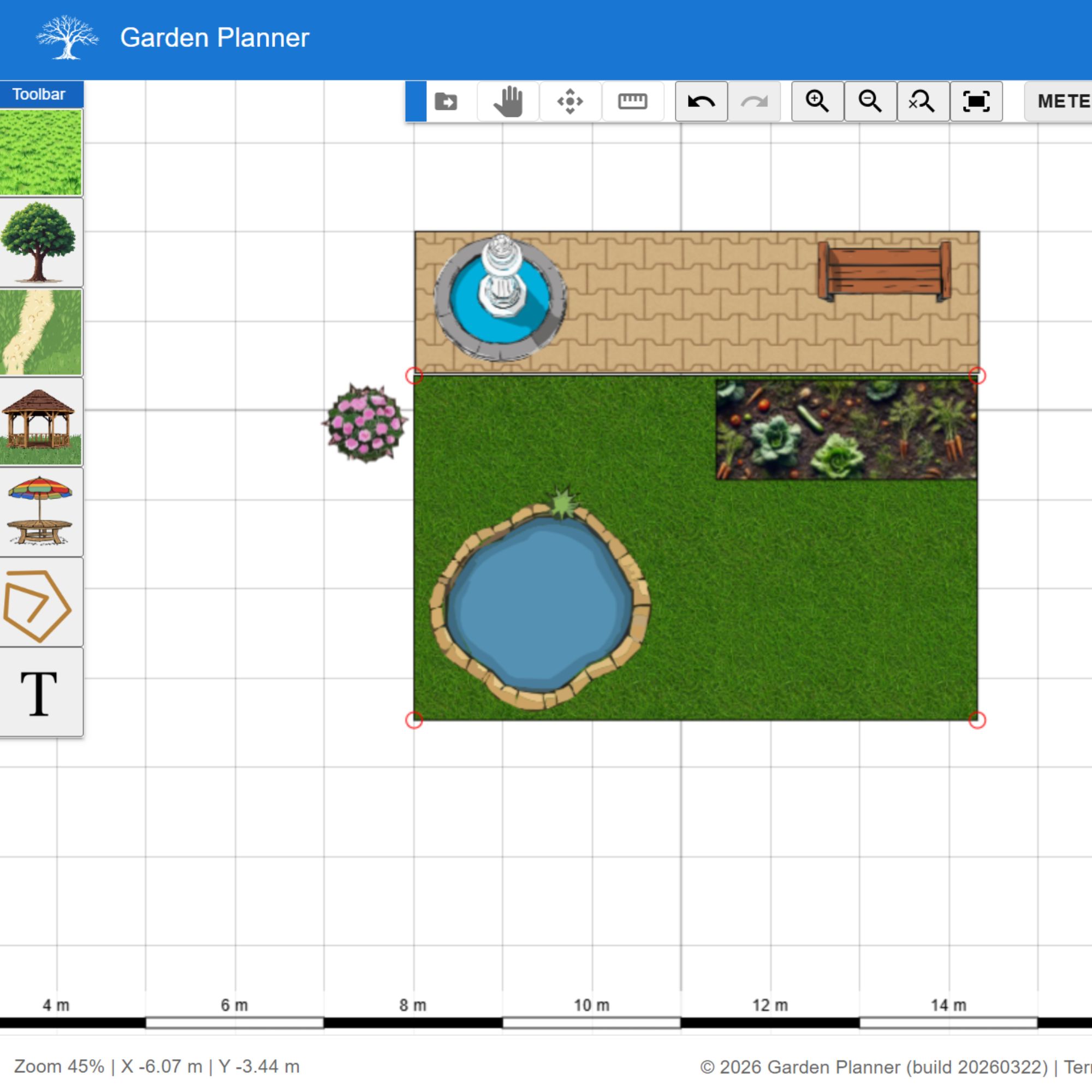 You don't need to pay, sign up or download any software – it's simply a case of entering the website. It's so easy to use, with a simple drag-and-drop function that allows you to easily resize patches of grass, paths, vegetation, structures and garden furniture. You can check the measurements of each piece by hovering over it with your mouse.