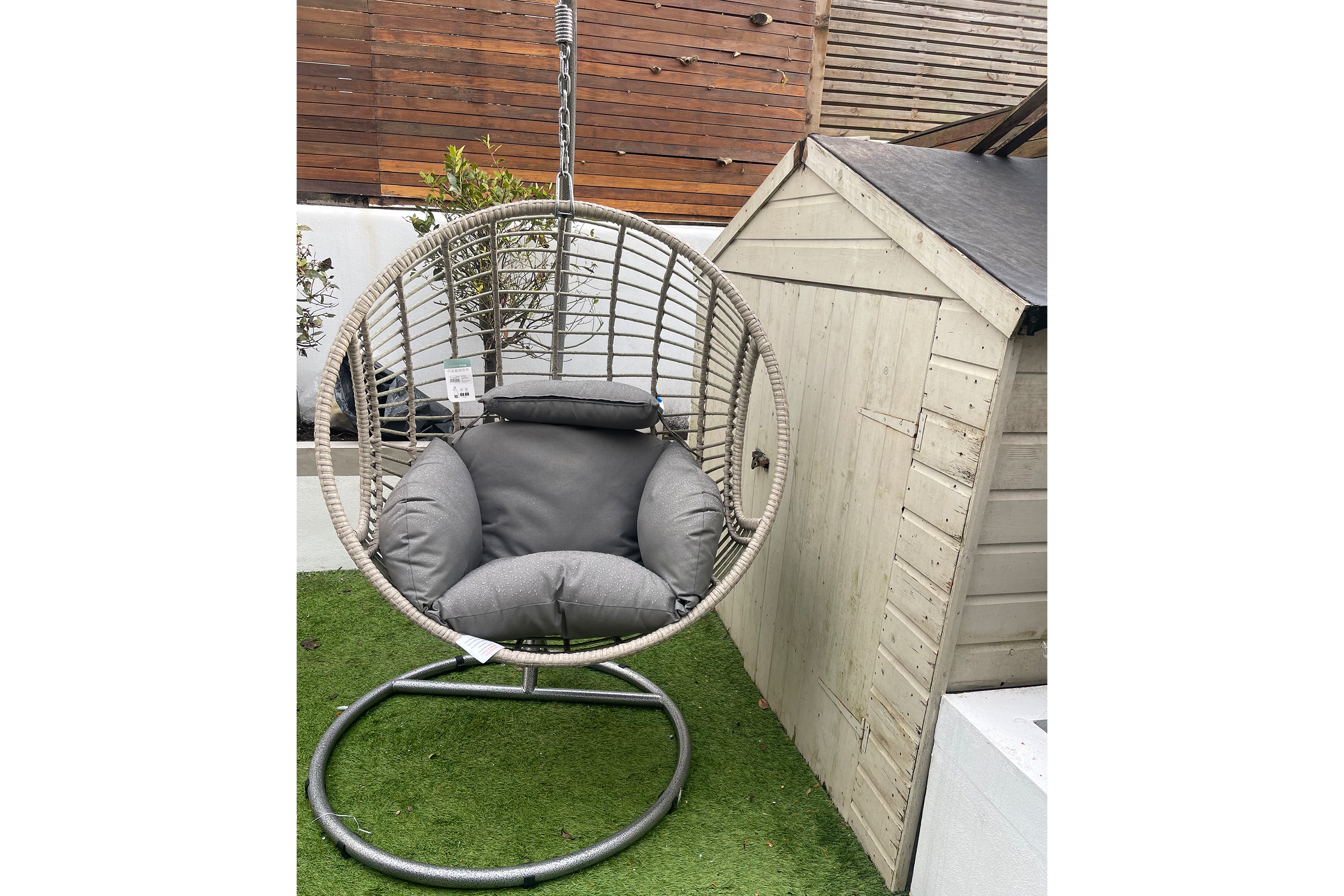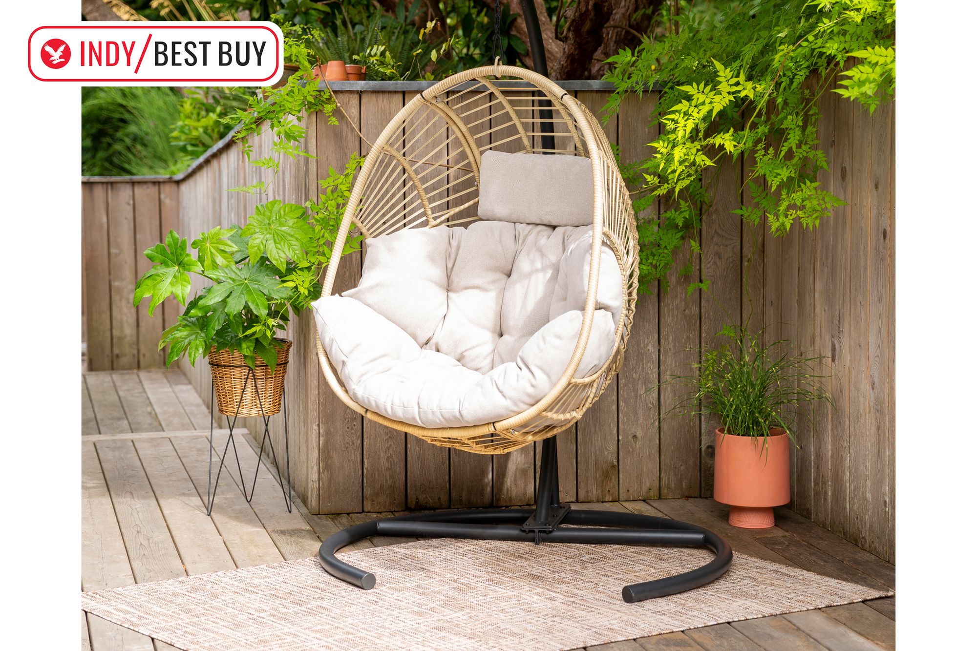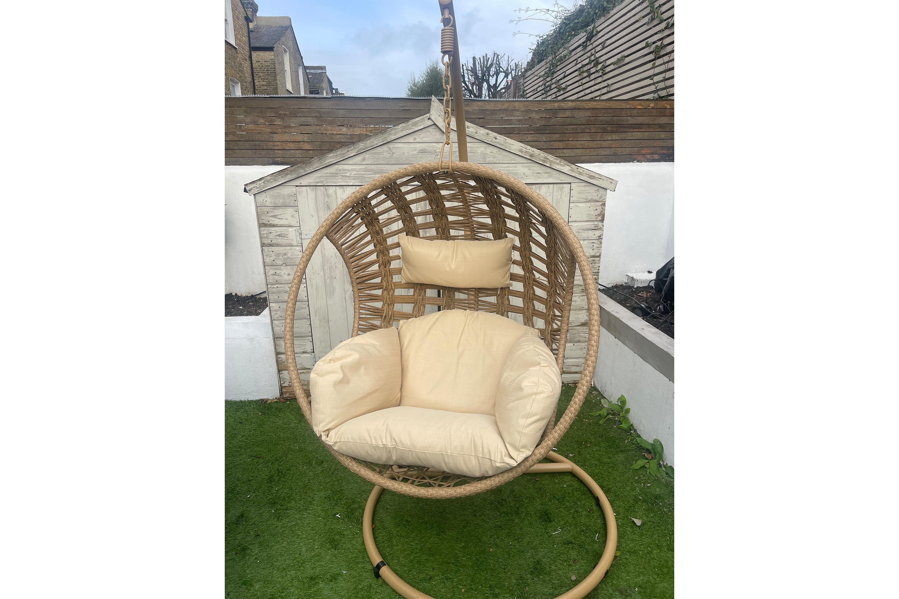 Dunelm Singapore hanging egg chair ticks every box as the best hanging egg chair I tested. The three-quarter circle, powder-coated metal base is easy to manoeuvre and find space for in smaller gardens (compared with full-circle base designs). The weatherproof rattan basket is particularly inviting too, thanks to its elongated cocoon shape, tan colour and spacious seat capacity.