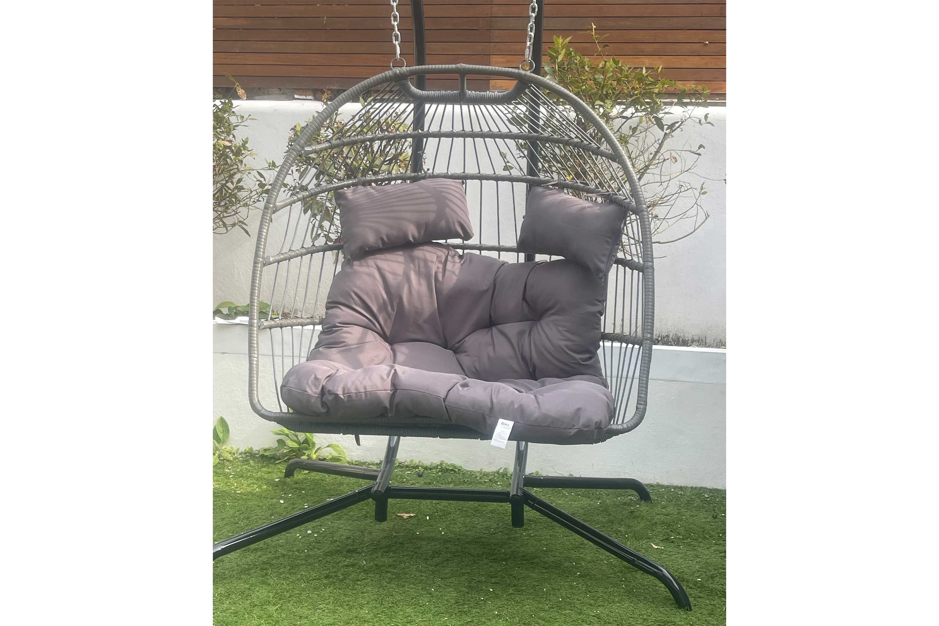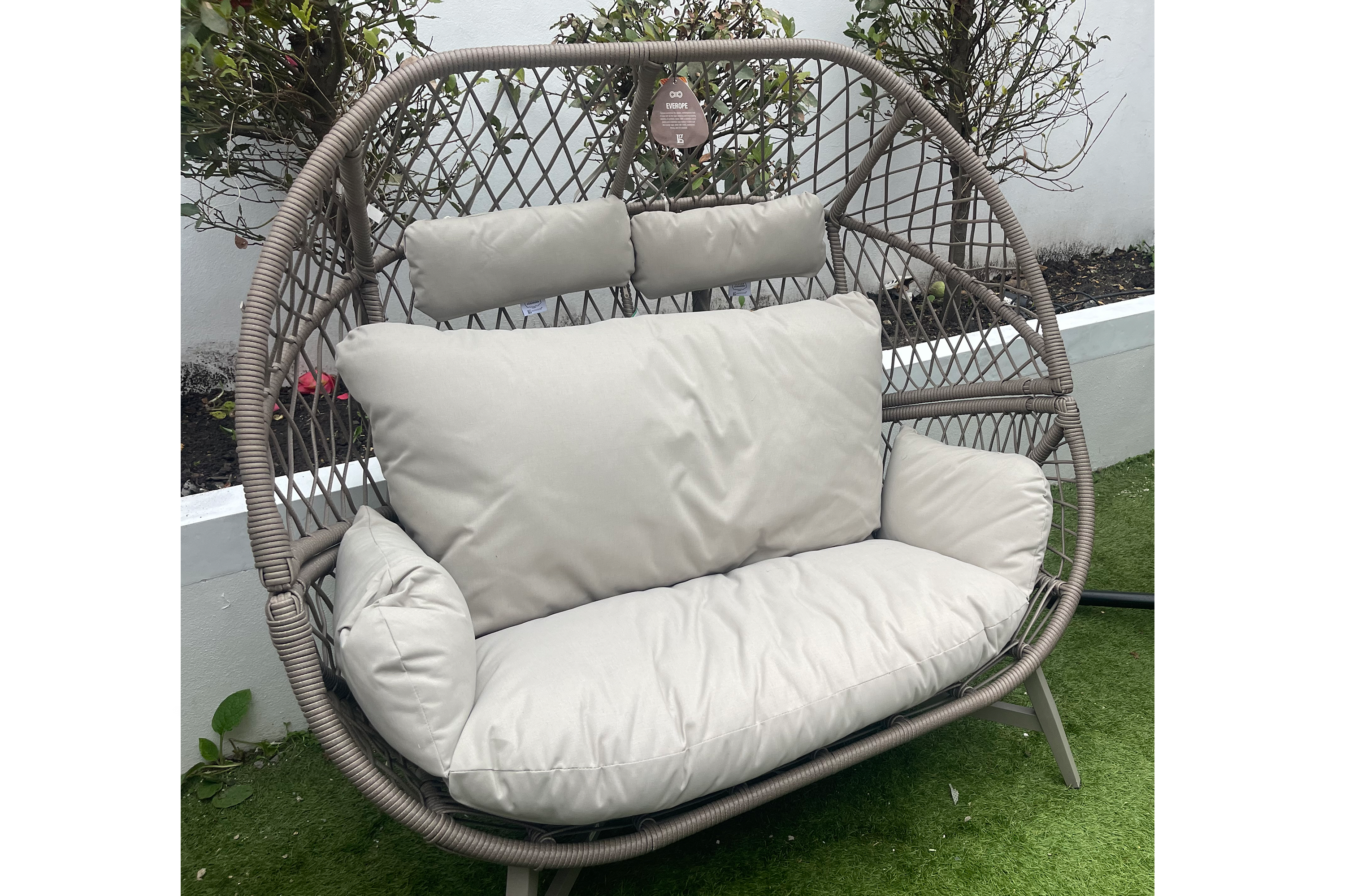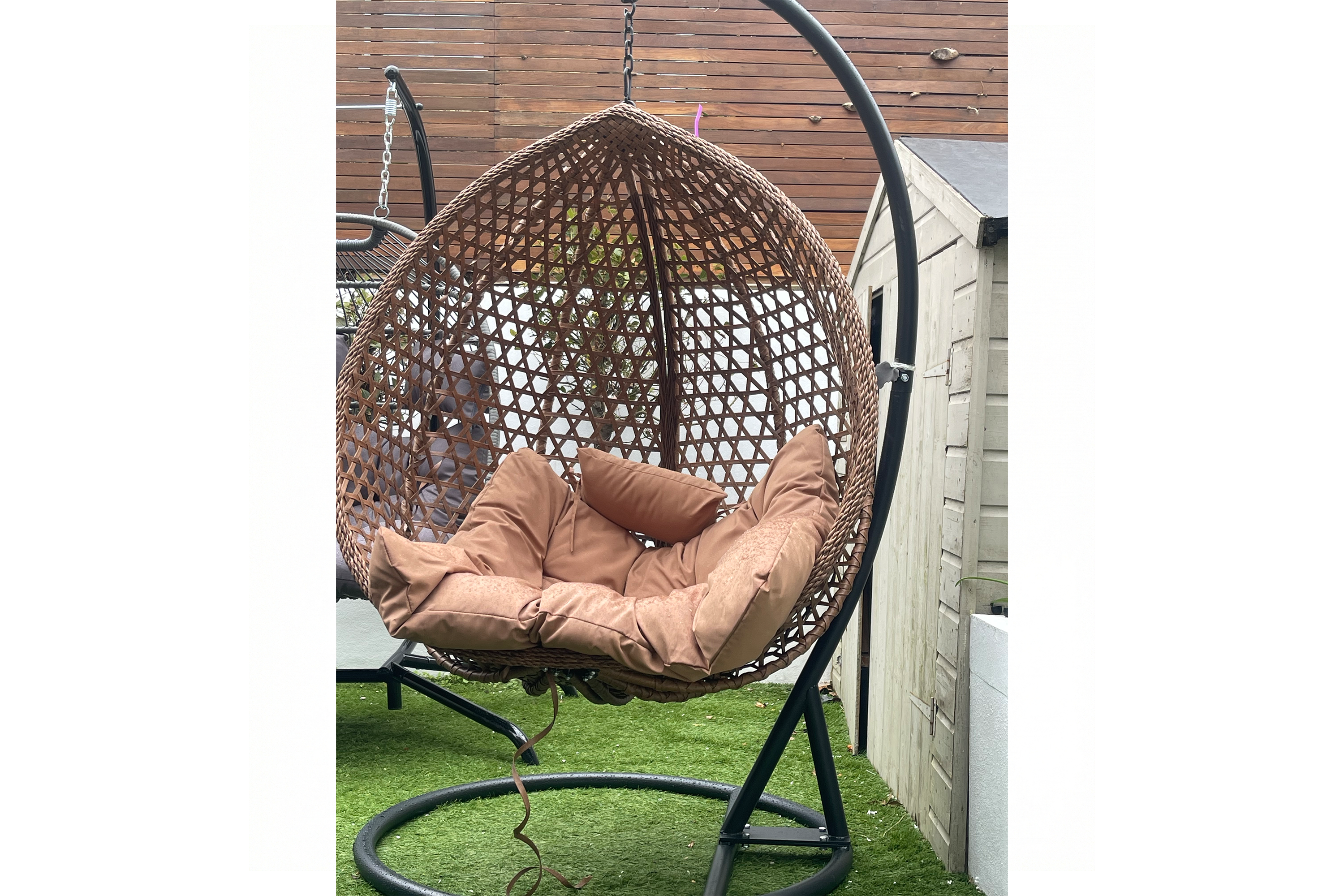 You get bang for your buck with Wilko’s Sophia double egg design, the best budget egg chair I tested, which features a white rattan, resin wicker seat mounted on a black powder-coated metal frame, with two poles and four legs. The double-seater is kitted out with two seat cushions and two head cushions.