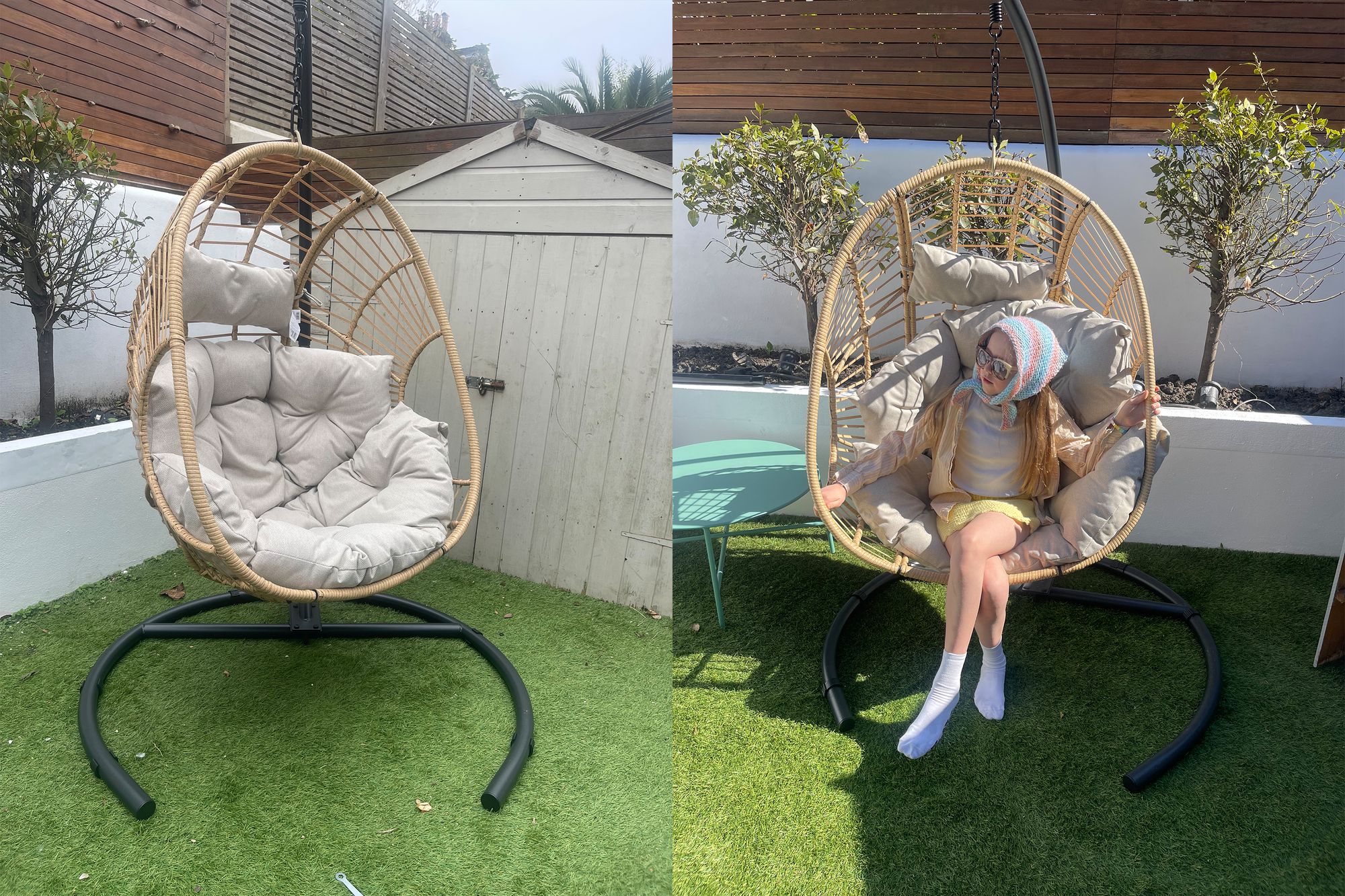 There’s an egg chair to suit every colour scheme, aesthetic choice (from rustic to contemporary) and family requirement out there, whether you’re after a solo-seater design or a side-by-side, couples-friendly option. Egg basket silhouettes also vary: I tested round balls, elongated cocoons, teardrops and even non-hanging designs.