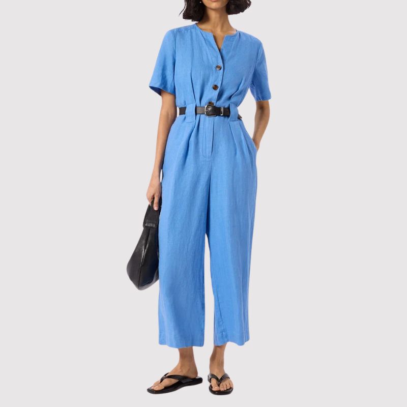 Made from a soft breathable linen blend, this bright blue jumpsuit is a cooling choice for the warmer sesaon ahead, and the vivid blue will liven up your spring outfit ideas. The curved, wide-leg shape is relaxed yet stylish, and the added waist loops mean you can dress it up with your favourite leather belt.