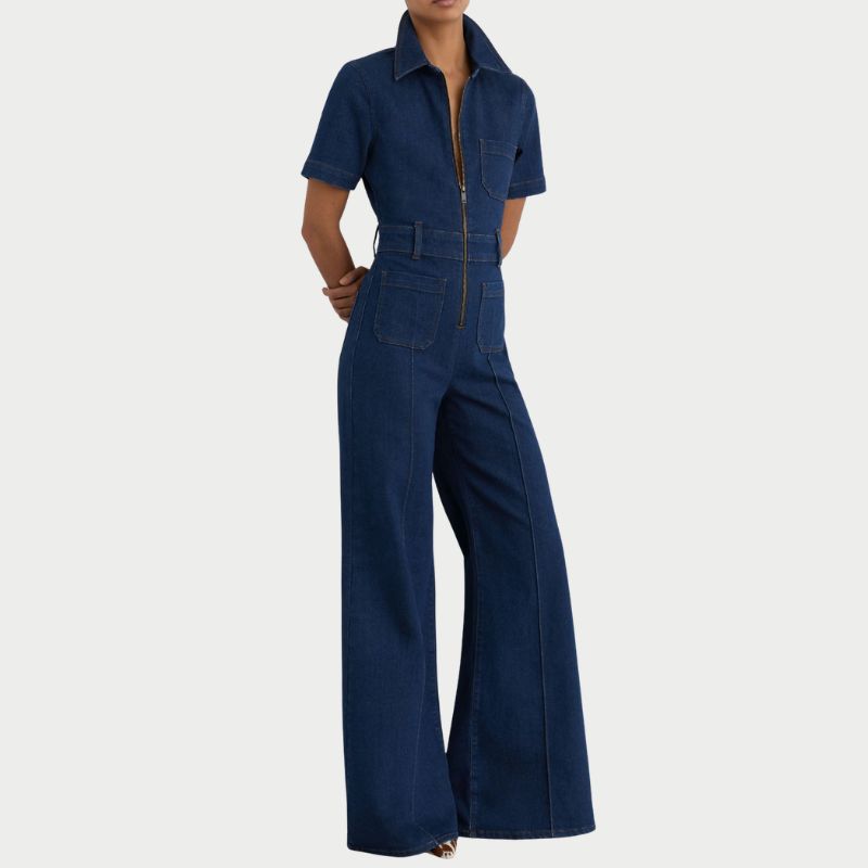 Hourglass figures benefit from styles that are more fitted on top, and the most flattering jumpsuits will nip you in at the waist. You can easily wear tailored trousers, although slightly fuller trouser legs, like this wide-leg denim style, will accentuate your waistline, creating more exaggerated curves. We think the short-sleeve design is so chic.