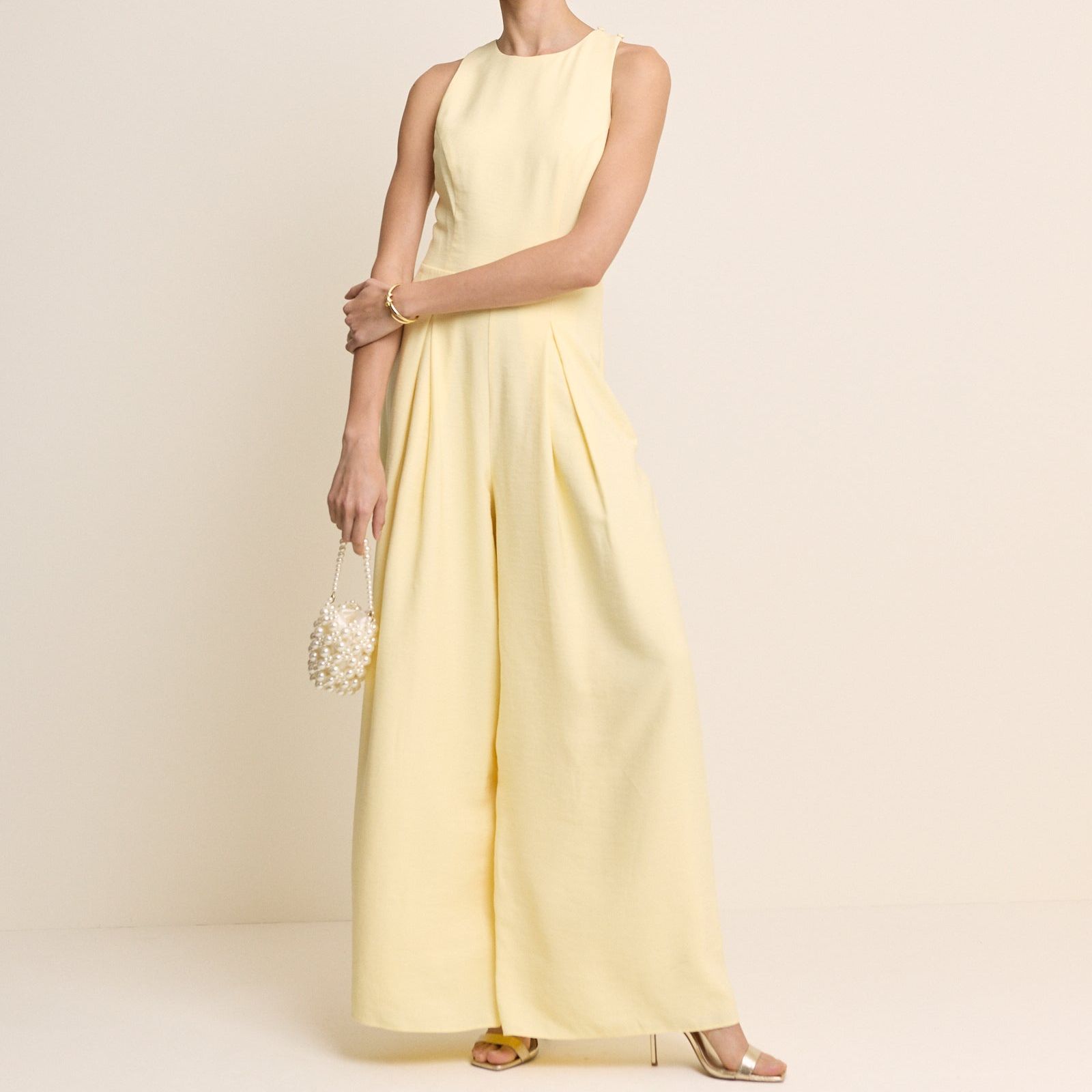Wide-leg trousers are great for adding curves to rectangular body types, as they help to add curves to your silhouette. This butter yellow jumpsuit is a fresh and lively addition to your spring and summer wardrobe. It features a striking crossover back and an elegantly draped wide-leg.