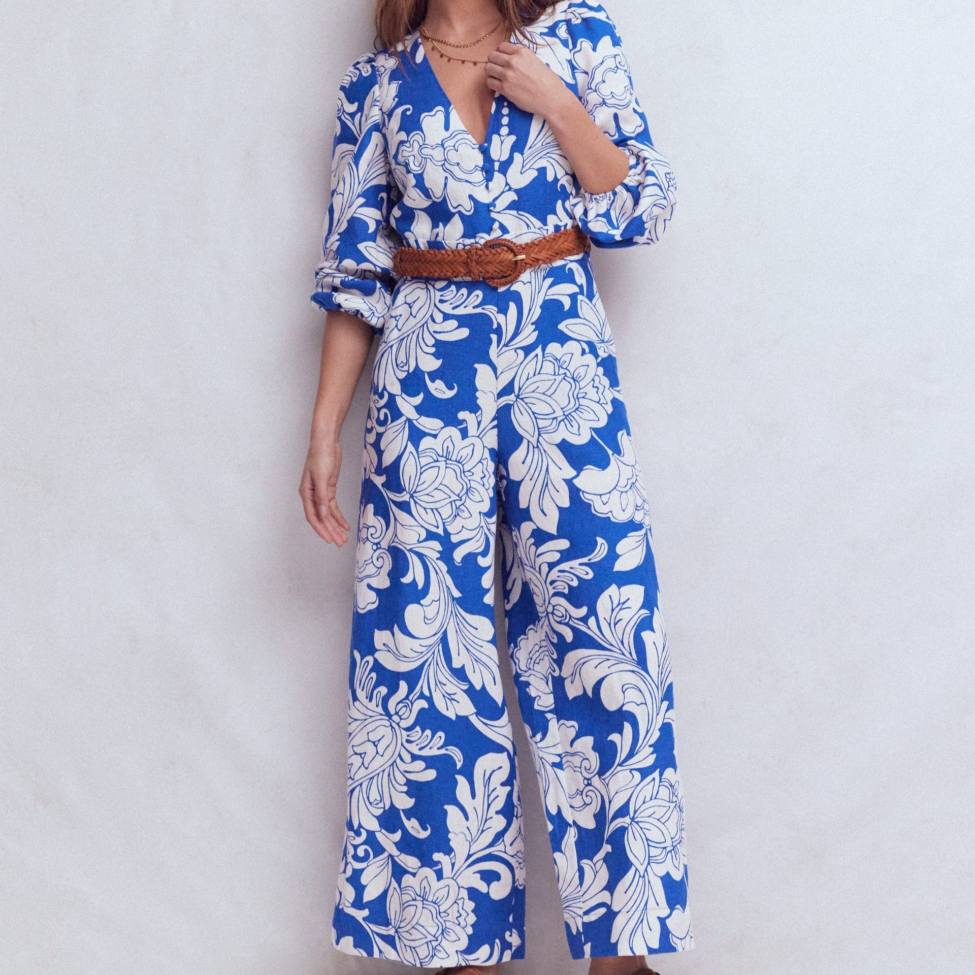 Dreaming of a warm-weather getaway? This botanical blue jumpsuit evokes the brighter, sunnier months ahead with its pigmented cerulean blue and large white printed florals. If you already have spring wedding invitations or are planning on Greek island hopping this year, we'd recommend snapping this design up quickly.