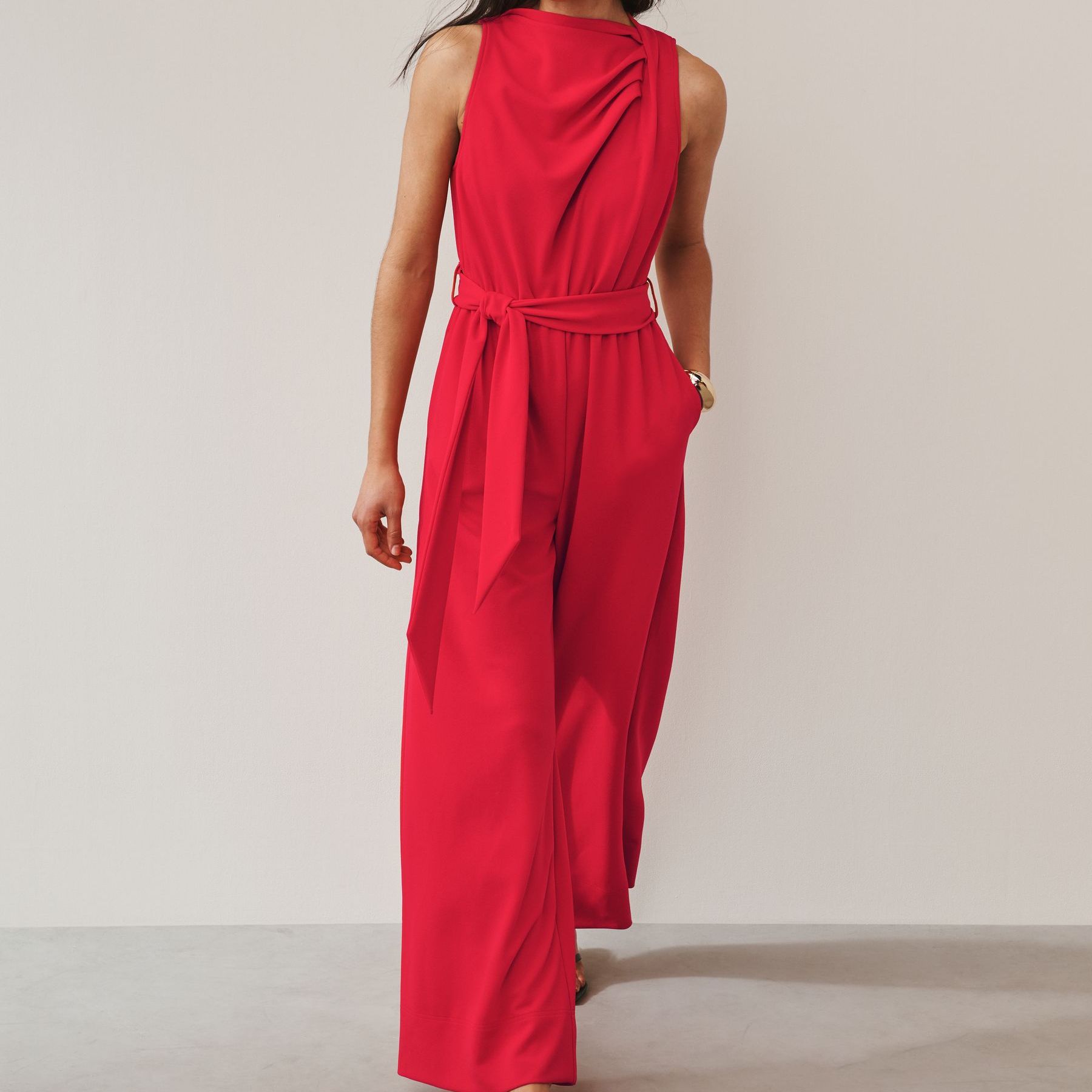Featuring a bold crimson red and a draped cowl-neck design, this jumpsuit feels far more expensive than it actually is. The soft jersey fabric also makes it a comfortable piece that you can wear all day long. The elegant silhouette and floaty wide-leg design make it the perfect occasionwear piece.