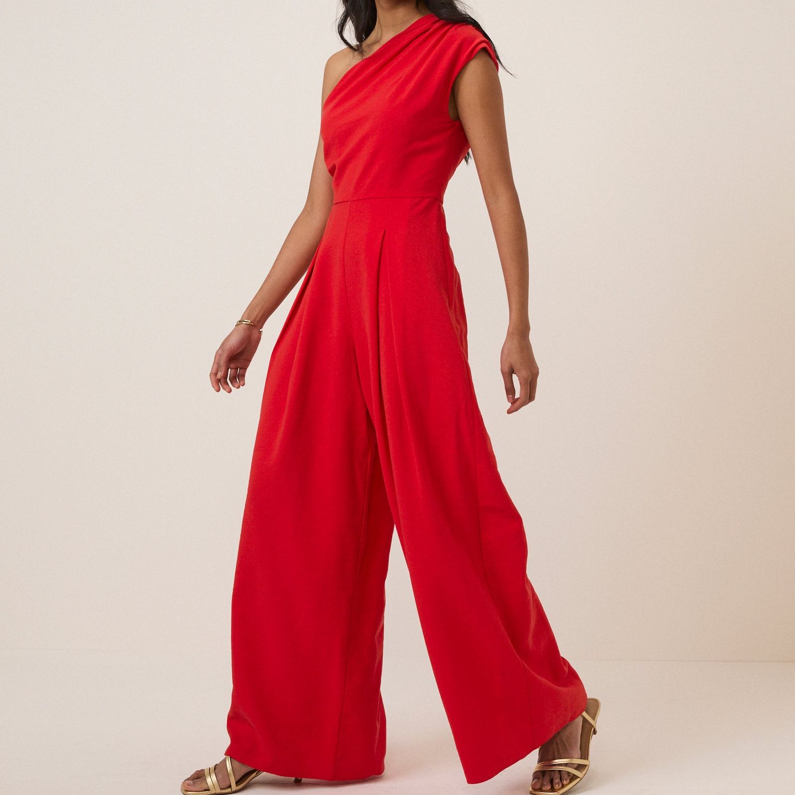 Wide-leg trousers are a pear shape's best friend. They’ll glide and flow to create a streamlined shape. Seek jumpsuits with noticeable details around the neck or shoulder, such as this asymmetrical shoulder, which will draw the eye upward. This bright, vivid red colour works perfectly alongside bright cream or ecru.
