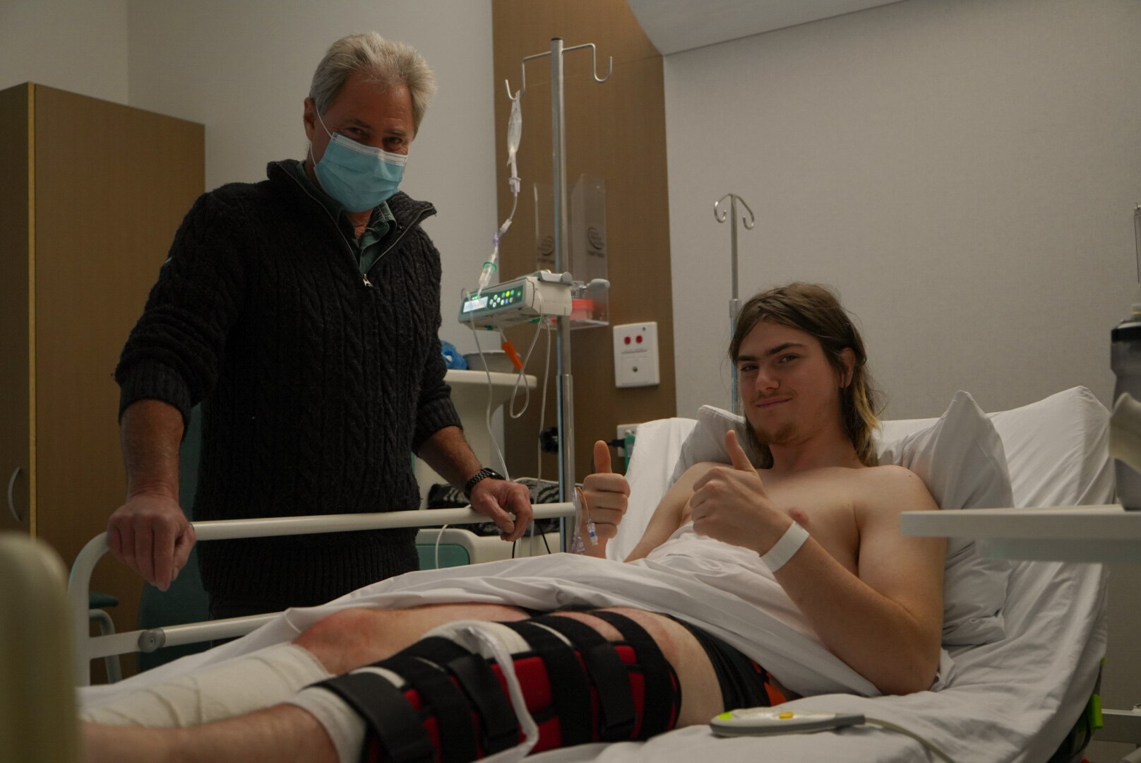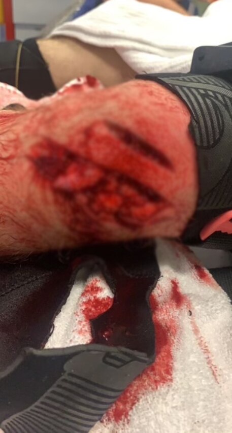 Luke suffered three lacerations to his lower legs, which were still bandaged on Tuesday.