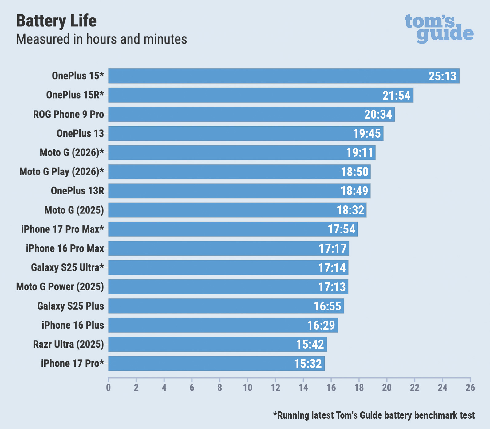All of the phones in the chart were run using a previous version of the test, while newer ones like the OnePlus 15, OnePlus 15R, iPhone 17 Pro Max, iPhone 17 Pro, and the 2026 Moto G devices were tested with an updated version.