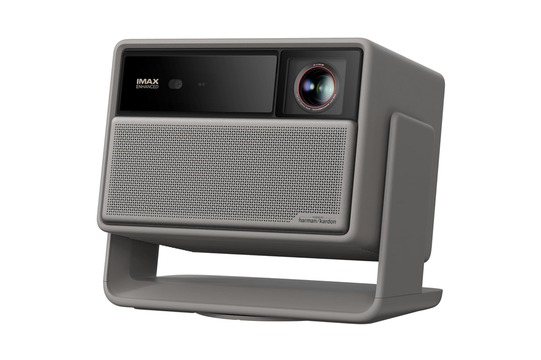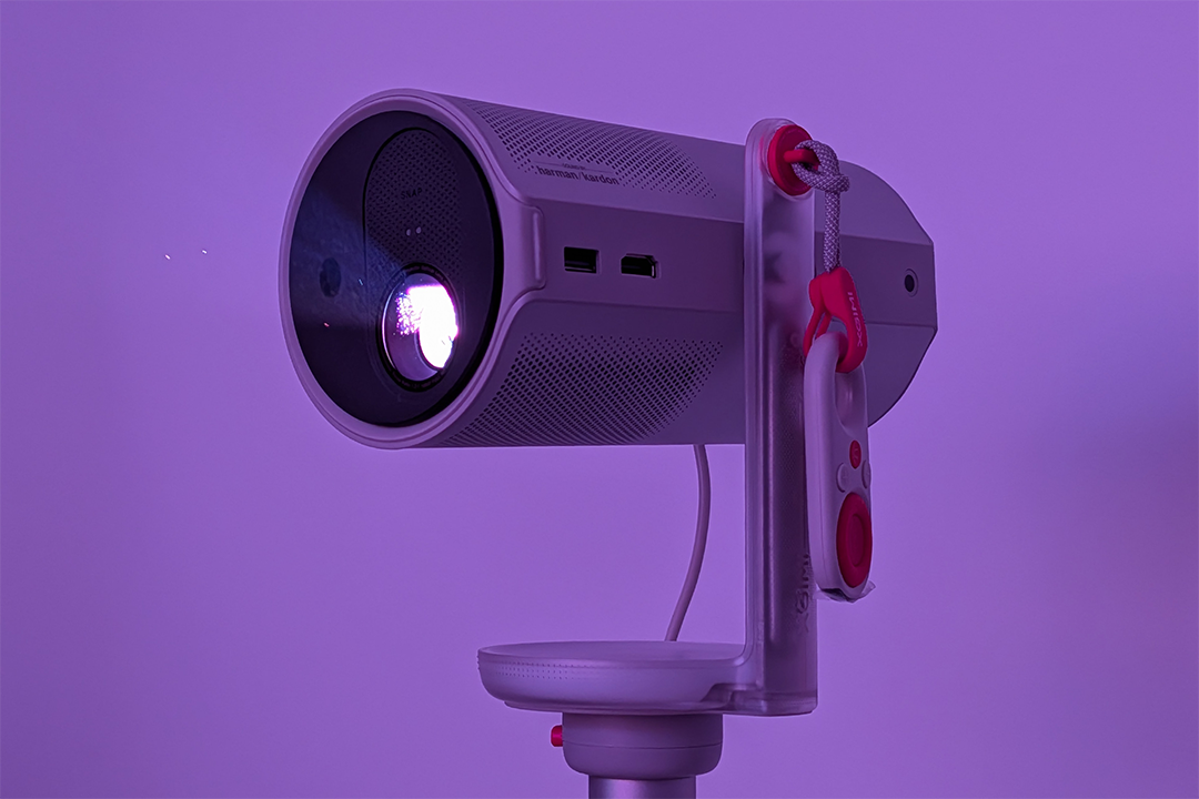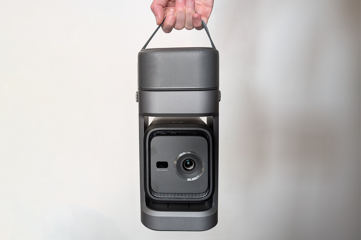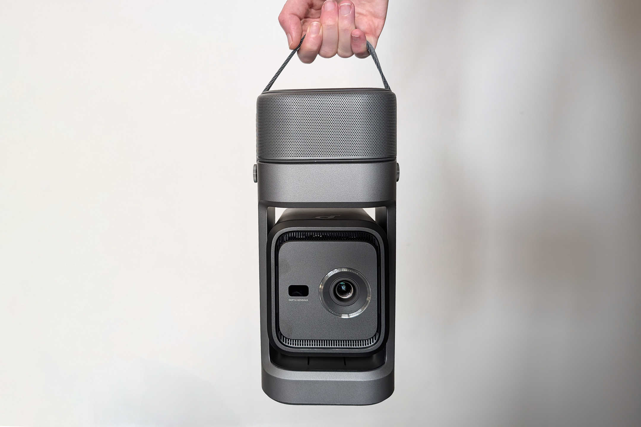Resembling a cross between a Rubik’s cube and the big robot from Interstellar, the TCL playcube is the most cleverly designed option I tested, and the portable projector for flexible viewing. Its boxy chassis is split into two sections, allowing the half that houses the lens to twist and pivot independently of the speaker section, making angling the projector a breeze. Twist it the full 90 degrees and you can project directly upwards for some exceptionally laid back ceiling viewing.