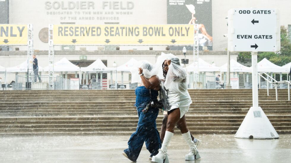 Songs by Fergie and Rihanna played over loudspeakers Saturday afternoon as crowds gathered as dark clouds loomed over the area and threatening to impact the show. The passing storms caused an evacuation of Pitchfork Music Festival around the same time.