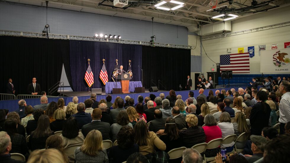 Biden spoke in the gym at Jones Elementary School in a semi-rural part of Will County, where fields with crops near the school have already been plowed or picked.