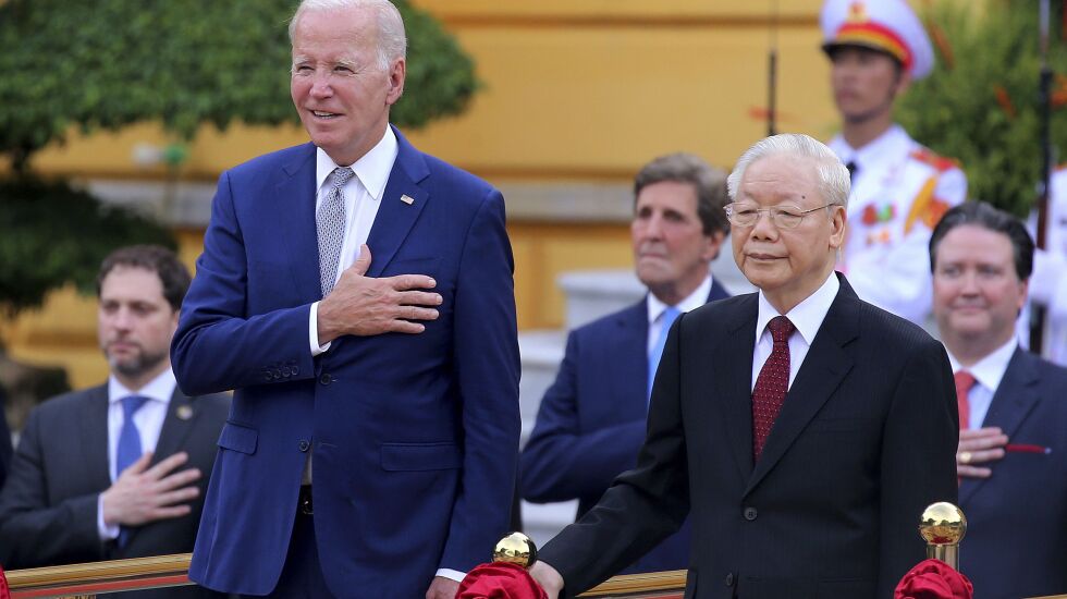 Biden called Vietnam “a friend, a reliable partner and a responsible member of the international community.” He noted that veterans such as John Kerry, his climate czar, and the late John McCain, a Vietnam POW and Republican senator from Arizona, found ways to build a relationship with Vietnam after the war.