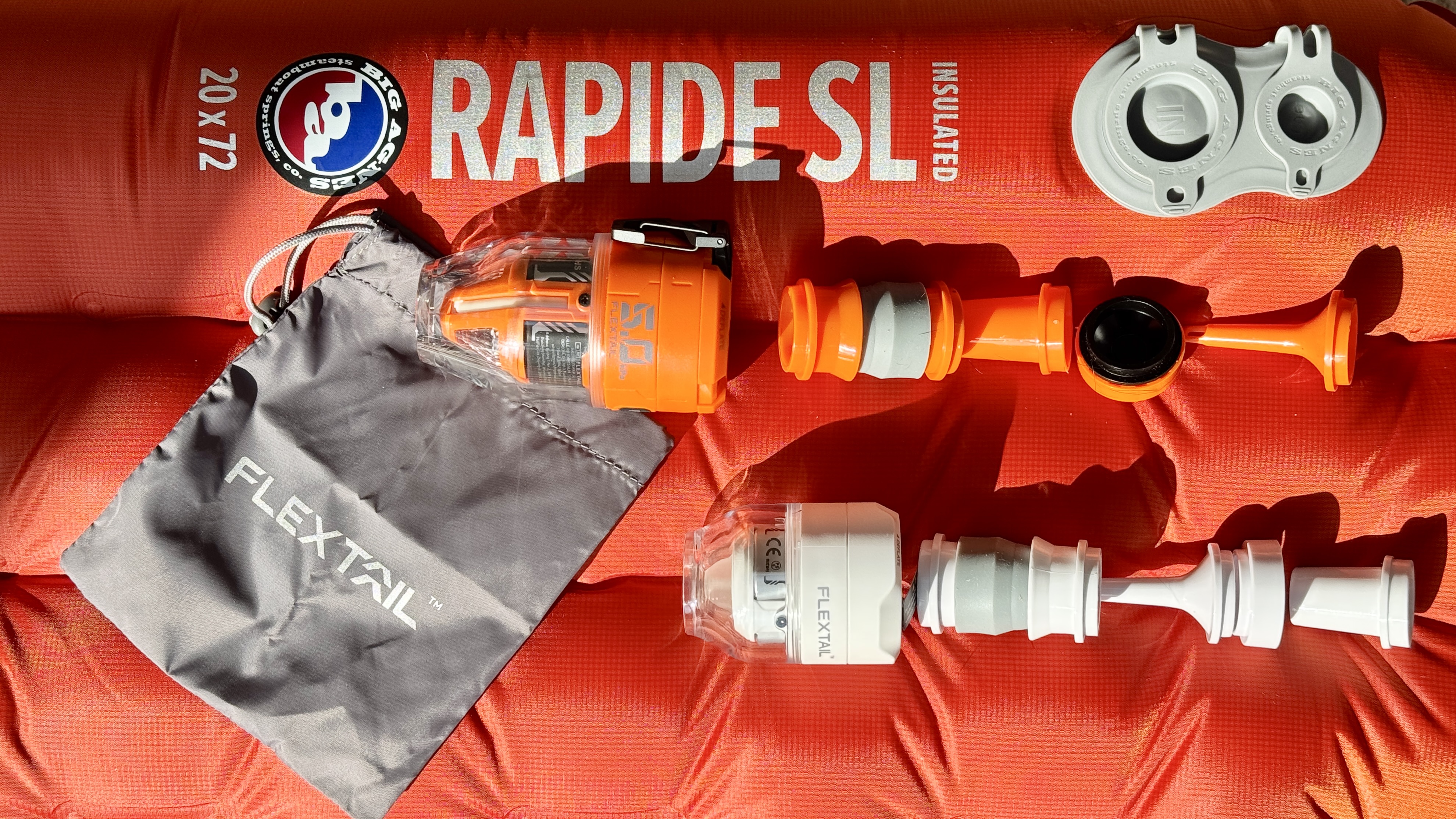 I first tried the Flextail MAX PUMP 3 which also serves as a 300-lumen LED lamp with three light settings, a fold-out tent hook and a tripod mount for setting it on the floor or table. The MAX PUMP 3 filled the Rapide SL in 23 seconds flat using its 5kPa (500 L/min) of ample pressure. It also made decent work of filling the much thicker Coleman Supercomfort foam mattress which also comes with a similar fill sack. These were amazing results, especially considering how small and light it is – just 122g. The MAX PUMP 3 comes with five adaptors to cover most types of air mattresses and water toys, plus a small nylon carry sack.