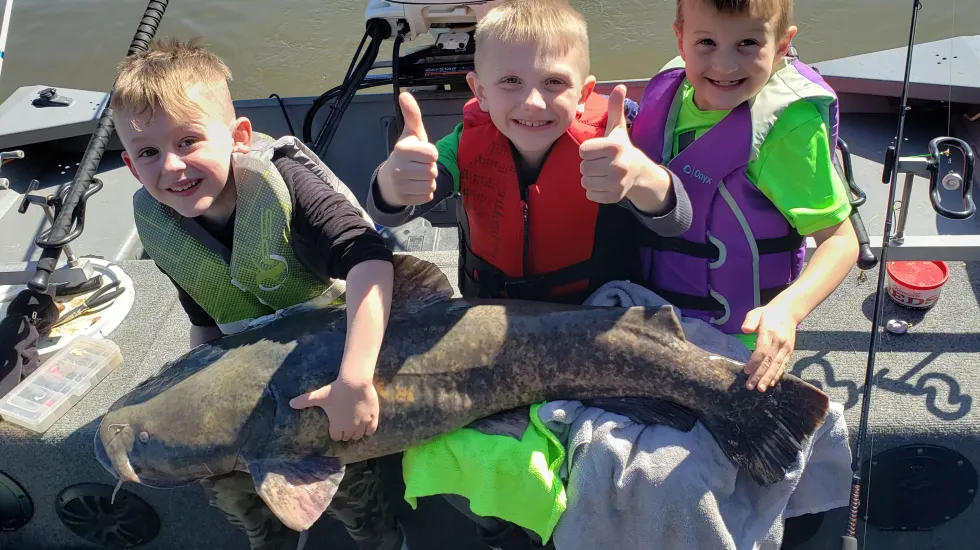 It’s Walker Gosa, 6, Kash Gustafson, 7, and Mason Mitton, 7, catching and releasing a 48-pound flathead catfish on the Rock River earlier this spring. The three boys are from Port Byron.