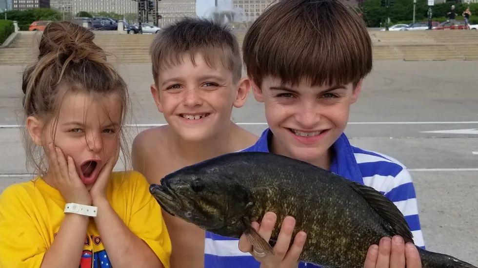 My all-time kids and big-fish photo before this came in the spring of 2018 (June 13, 2018 Sun-Times) when the Marx clan—Kelly, Parker, Connor—of Winnetka showed utter joy at a big smallmouth bass caught near Buckingham Fountain.