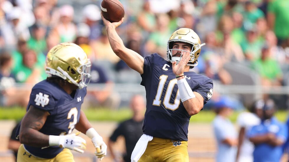 No. 10 Notre Dame (+7½) at NC State (11 a.m., ABC 7, 780-AM): In three games against the Wolfpack — two of them losses — while playing for Wake Forest, Irish QB Sam Hartman threw a total of six interceptions and was sacked 13 times. He has a better team around him now, one would think, but Wolfpack defensive coordinator Tony Gibson clearly has a good read on the talented passer. The Irish defense might have to steal the show. Domers, 24-20.