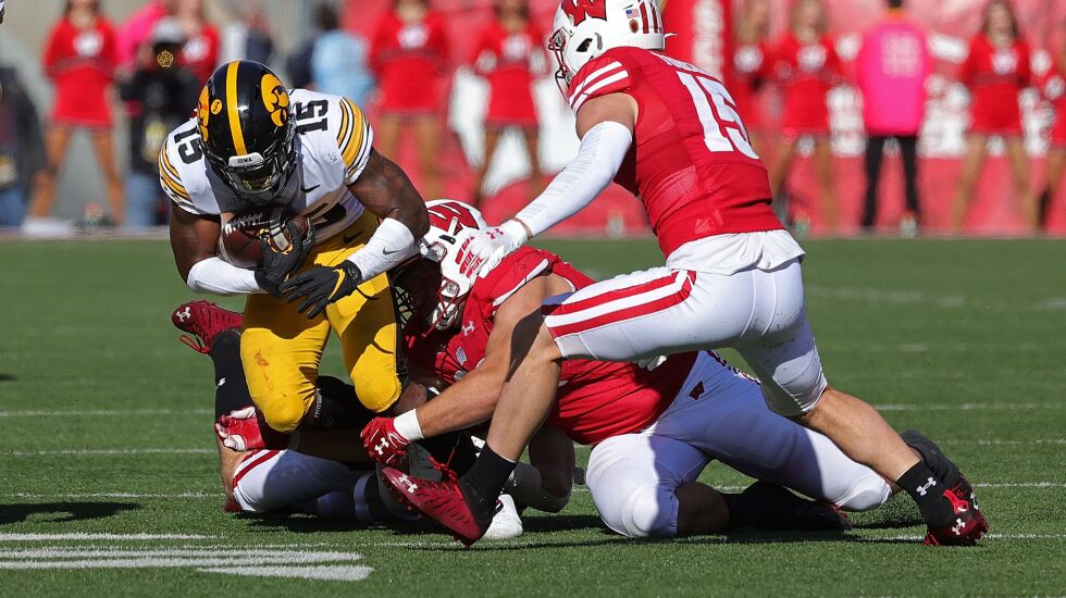 Wisconsin (-1½) at Iowa (2:30 p.m., FS1): The Badgers have taken eight of the last 10 Heartland Trophy games, but Iowa’s 24-3 win at Purdue last weekend was an eye-opener. The Hawkeyes’ turnaround continues, 20-14.