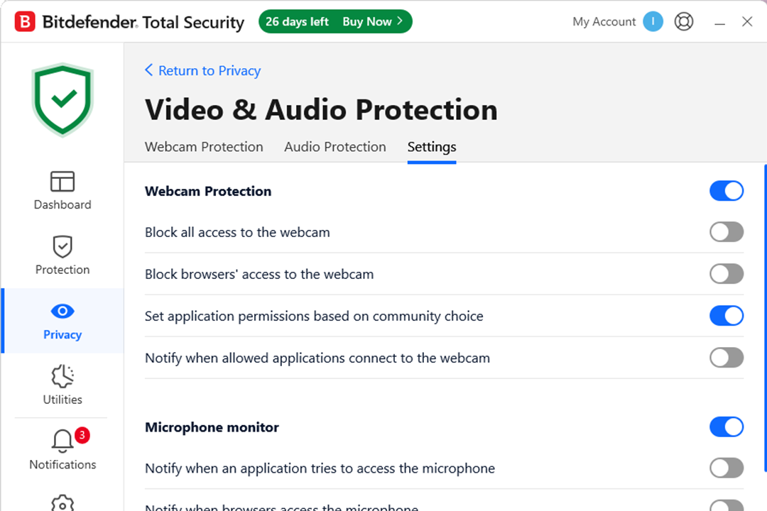 Video and audio protection pevents malware from hijacking your computer’s webcam and microphone (Bitefender)
