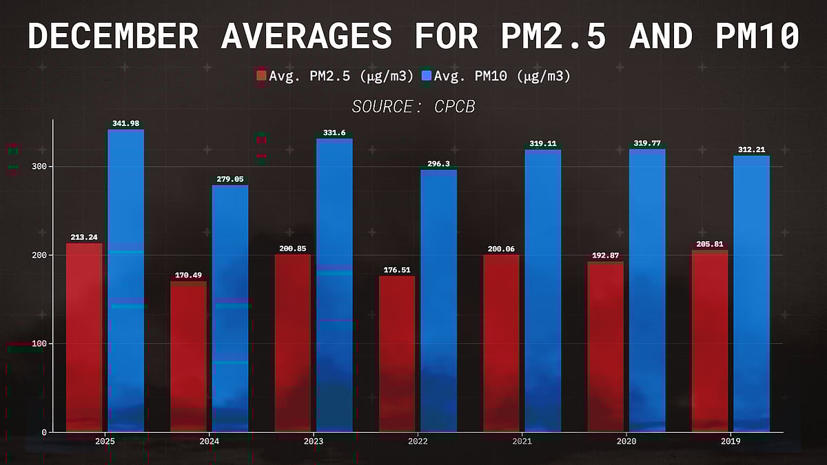 In fact, December 2025 was the most toxic the city’s air has been in seven years, with a monthly average AQI of 351, according to an analysis of the Central Pollution Control Board’s data. The daily average AQI hovered above 300 on 22 days, and fell into the ‘severe’ category on five days. The air was at its worst on December 14, when AQI spiked to a hazardous 461. Even the “cleanest” day – Christmas – managed only 234, still firmly in the “poor” category. The trends reflect in PM2.5 and PM10 numbers too.