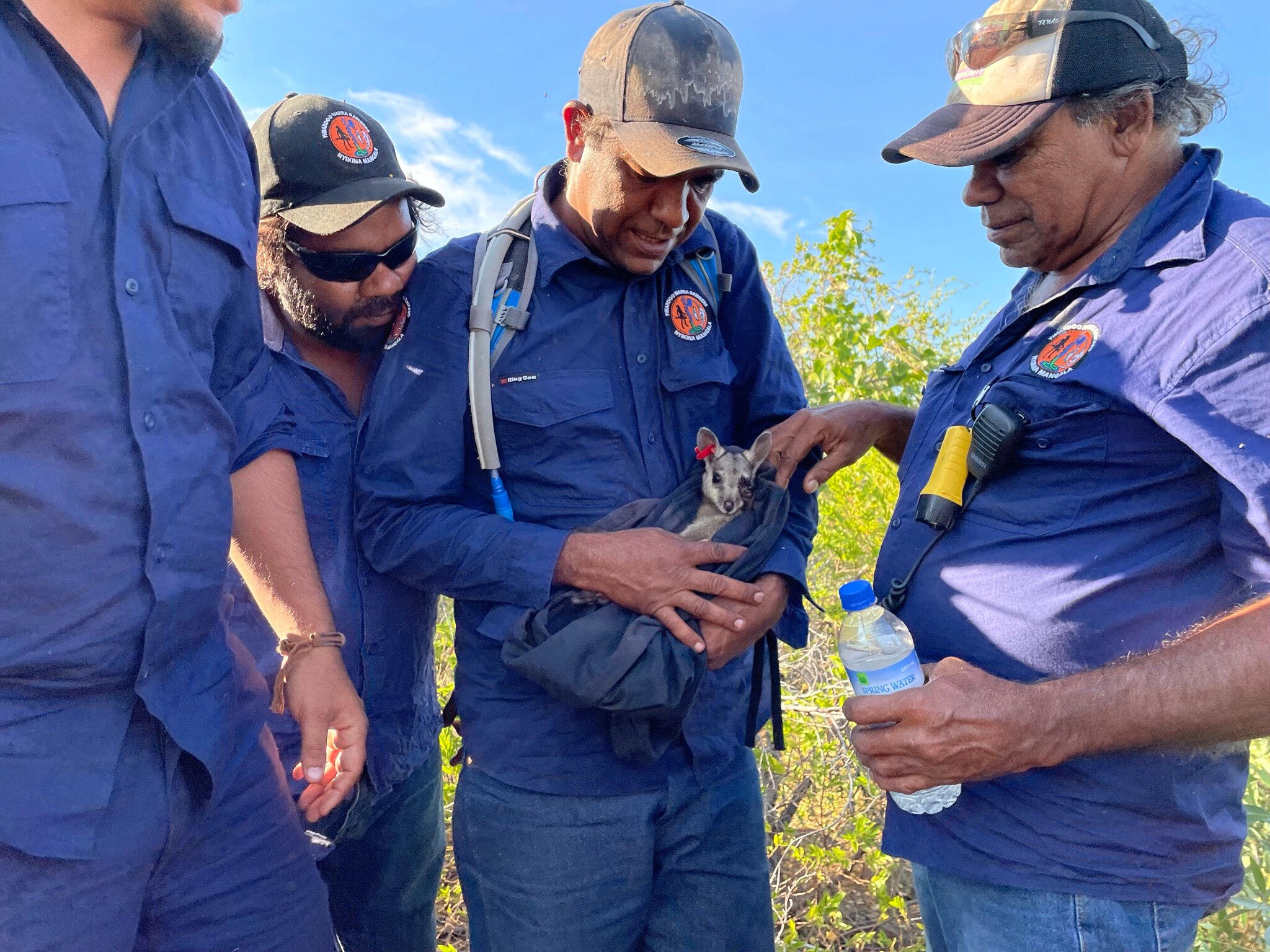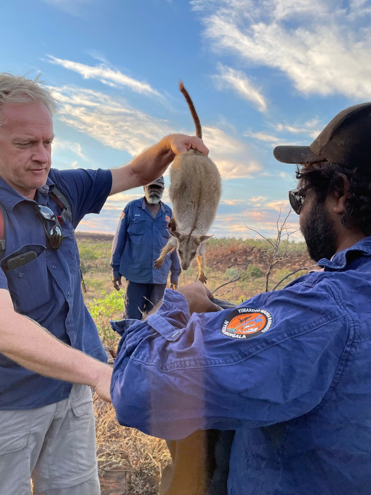 Research scientist David Pearson bags a black-footed rock wallaby with the Nyikina Mangala Rangers. (Supplied: WWF-Australia)