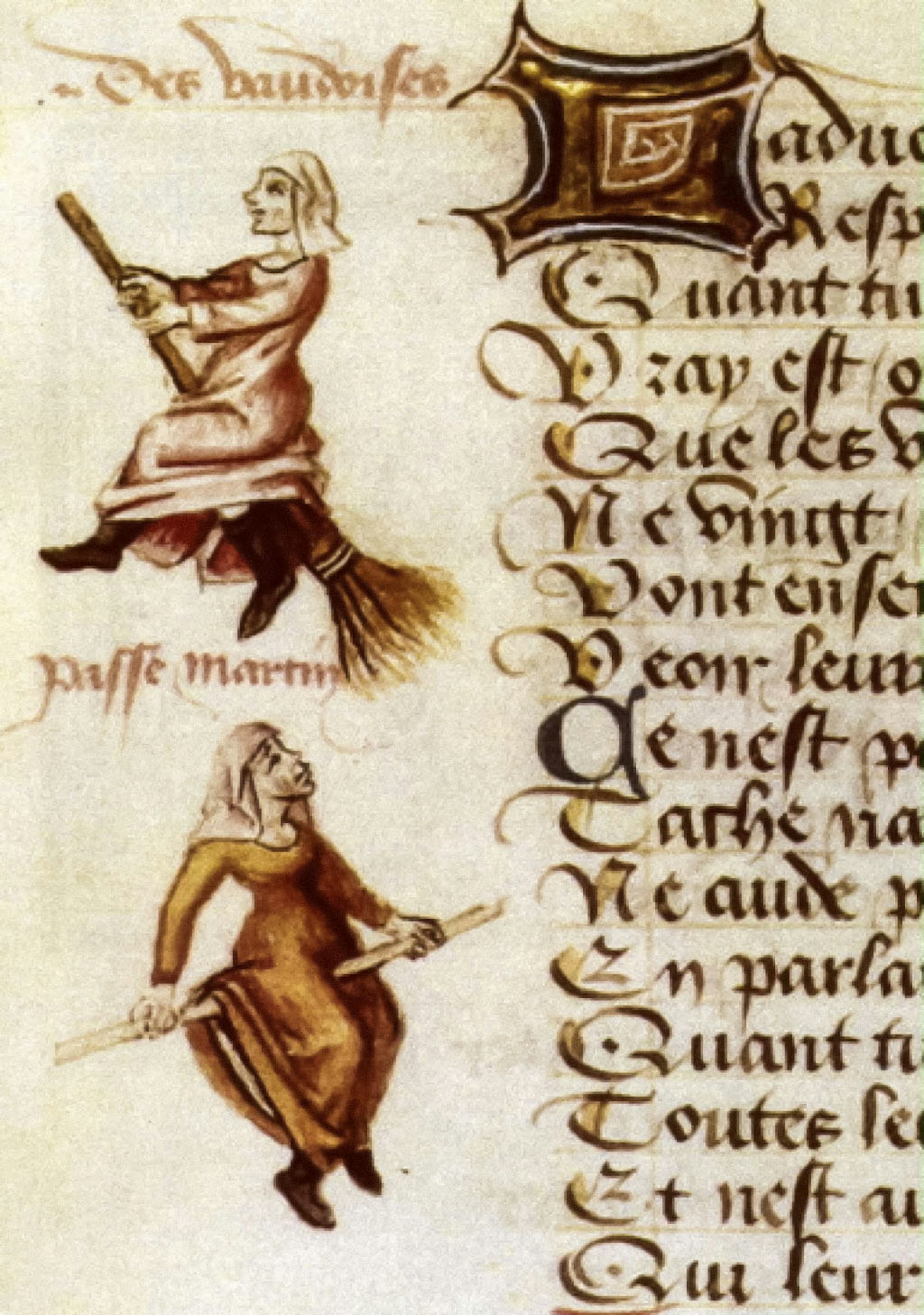 The first image of women flying on broomsticks is believed to be in the manuscript of French poet Martin Le Franc’s Le Champion des Dames (The Defender of Ladies), published in 1485. Women sat astride broomsticks are drawn alongside the text, in the margins of the pages, much as accused witches were often maligned women on the margins of society.