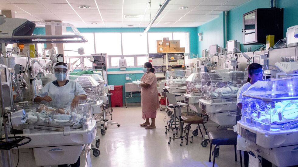 File photo of a woman visiting her newborn baby at a nursery in April 2020. (Ezequiel Becerra/AFP via Getty Images)