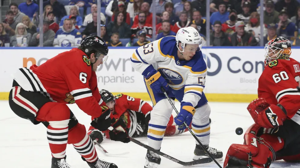 The Hawks squandered 1-0 and 2-1 leads, conceding the tying goal to Owen Power with 5:38 left in regulation and the winning goal to Casey Mittelstadt just 2:07 into overtime. They were outshot 19-4 after the second intermission, spoiling a solid final start by Collin Delia. Since late March, the Hawks blew 19 of the 20 leads they at some point held.