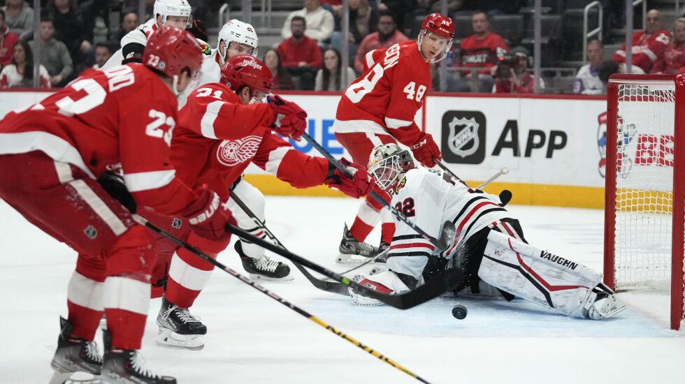 But Stalock’s efforts weren’t enough. The Wings tied the score at 3-3 on a goal by Lucas Raymond with 7:24 left, and former Hawks forward Dominik Kubalik scored the tiebreaker with 4:07 to play. It was the Hawks’ fifth loss in their last six games.