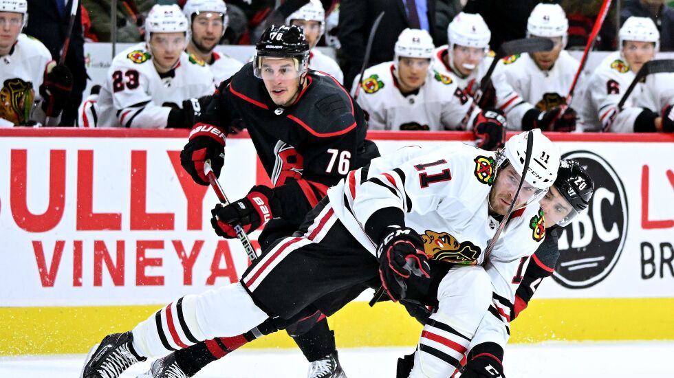 The Hawks’ defensive pairing of Connor Murphy and Isaak Phillips failed to pin the Hurricanes’ forwards in a puck battle along the boards below the goal line. That stranded Jonathan Toews, who was correctly hovering and “waiting to try to scoop the puck,” Richardson said. That pin-and-scoop technique to kill plays defensively has been emphasized often lately.