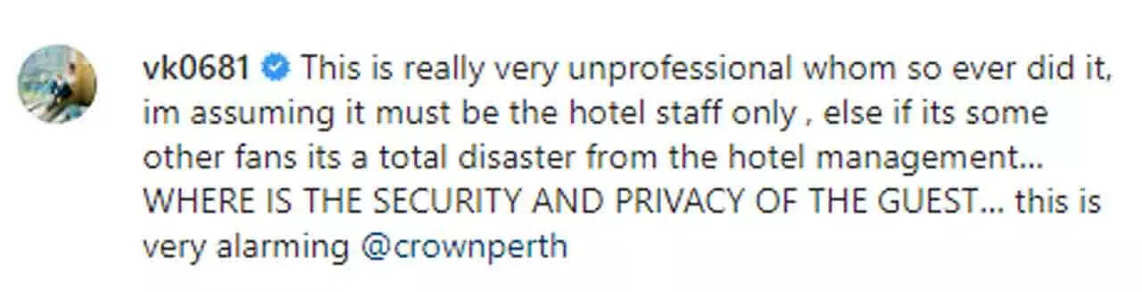 Virat's brother Vikas Kohli revealed the name of the hotel while replying on Virat's Instagram post, by tagging them. The hotel in question is the Crown Towers, in Perth.