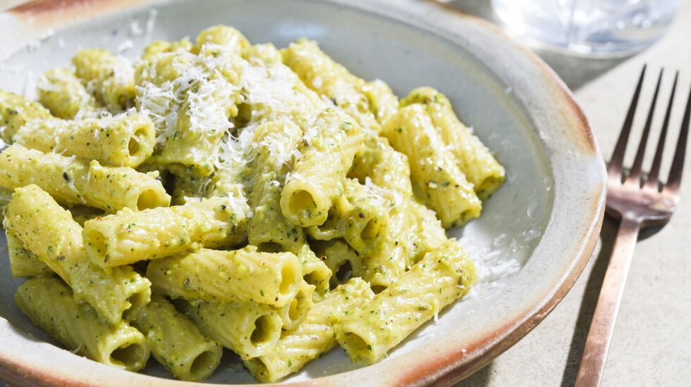 There’s no need to grate the Parmesan, the nuttiness of which complements the pistachios. Simply cut it into chunks and toss the pieces into the blender. The pesto is good on a wide variety of pasta shapes, but the hollow centers and surface ridges of rigatoni do a particularly good job of gripping the rich, creamy sauce.