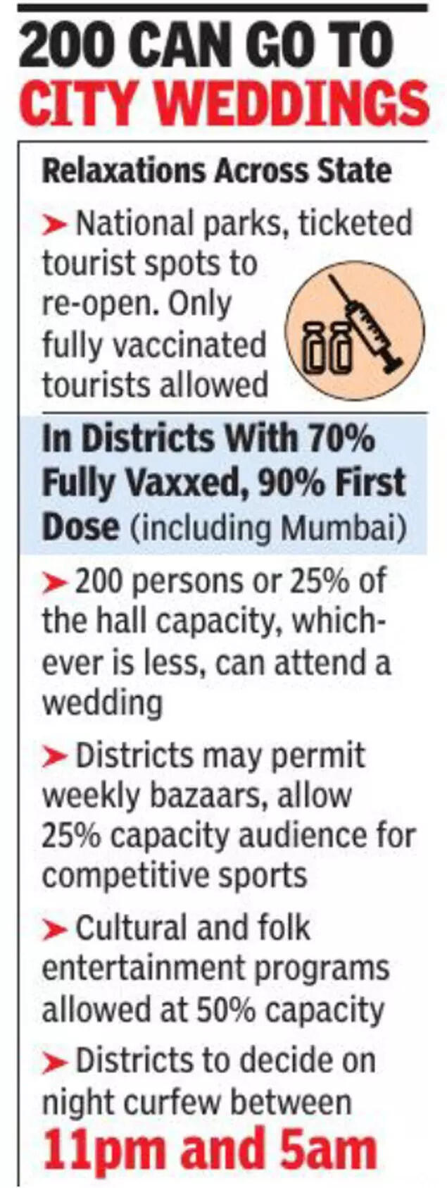 It further allowed bigger weddings, review of night curfew hours, possible extension of timings for restaurants and theatres, and reopening of swimming pools in districts that have fully vaccinated 70% of their 18-plus population and given 90% at least one shot.