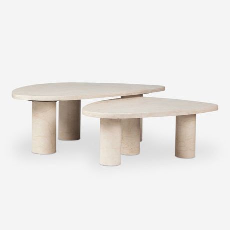 The solid, earthy material of these coffee tables contrasts with the curved, sculptural shape to bring a sense of natural calm and comfort to a room, while the nesting design adds an even more organic feel.
