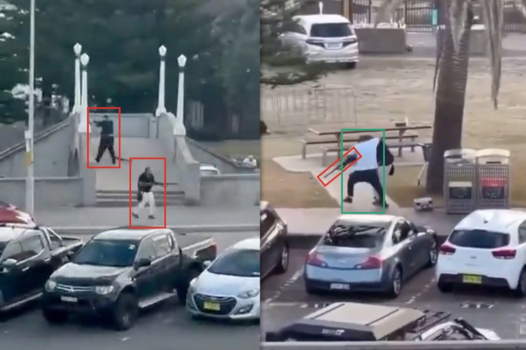- Sometime after 6.45pm – Two shooters can be seen firing from a bridge towards people at the Chanukah by the Sea event. They have a number of guns. Video footage shows cars driving past them as they shoot.