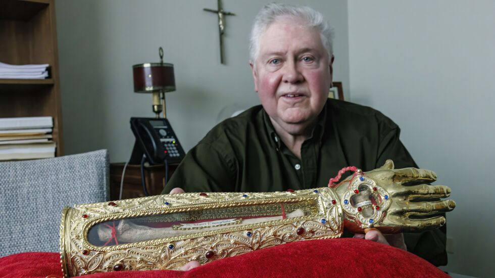 The Rev. Dennis O’Neill, who founded the shrine, says he recently purchased ulna (arm) and carpal (hand) bones from a middleman who got them from the family of a deceased Italian cardinal who’d gotten them from a Venetian church where most of Mark’s body might be interred.