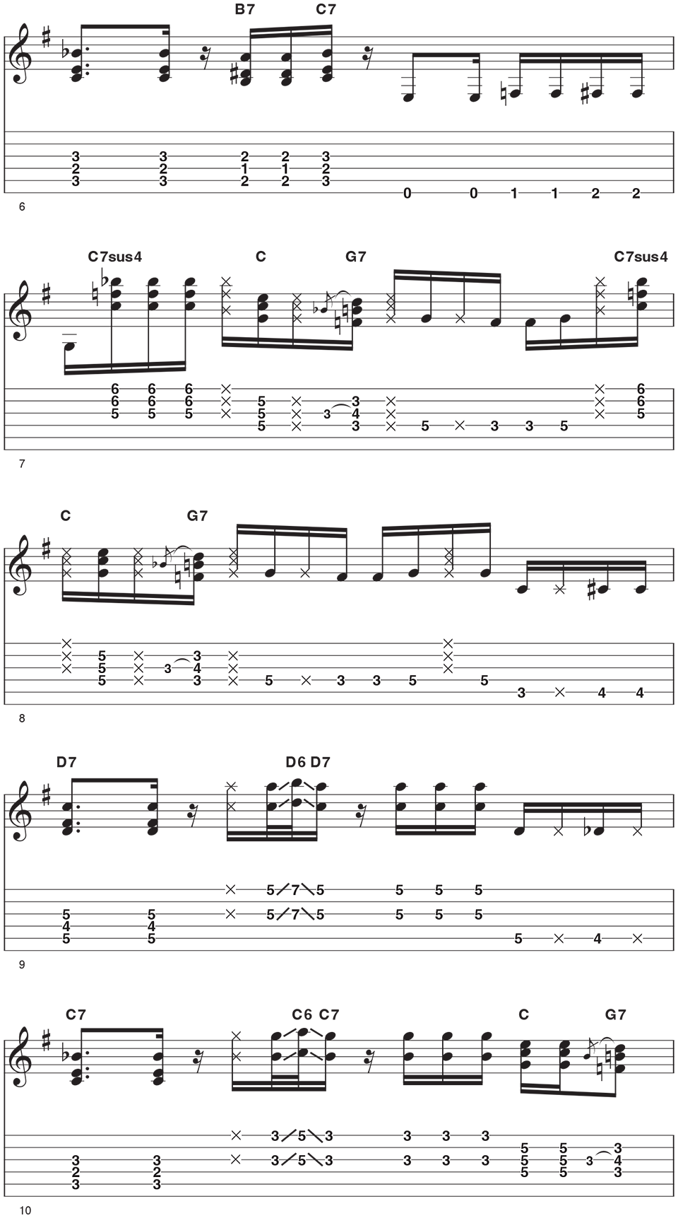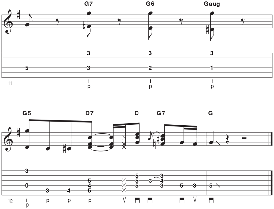 For bars 1-4, a G7 based chord riff is played using fragments of C7sus4 and C before resolving to a G7, complete with a quick bluesy hammer-on from Bb to B. The 16th note strumming is played with constant down and up strums while muted strings and chords are created by the fretting hand. You will notice that no bar has the same playing in it, with small variations each time that create excitement and variety.For bars 5-8, you will move to the IV chord (C7). Extra interest is introduced into the C7 groove with a brief dip down to B7 one fret lower. The walking bass line from E back up to G is classic blues fare. You then repeat the part that was established in the first four bars. For bars 9-13, you move to the V chord (D7). To spice this up, Ally employs a SRV-style lick that uses sliding sixths on the third and first strings. This provides tasty upper D6 and D9 colors and contrast to the lower D7 chord shape. This sixth based lick is repeated two frets lower to outline the IV chord (C7). As the saying goes, if it's nice, play it twice!Her performance ends with a Robert Johnson style lick, and Ally quickly moves over to fingerstyle to pluck the two notes. Use the thumb and first finger to pinch the two notes, putting the pick between your fingers to keep it out of the way (unless you want to hybrid pick this with pick and the second finger).