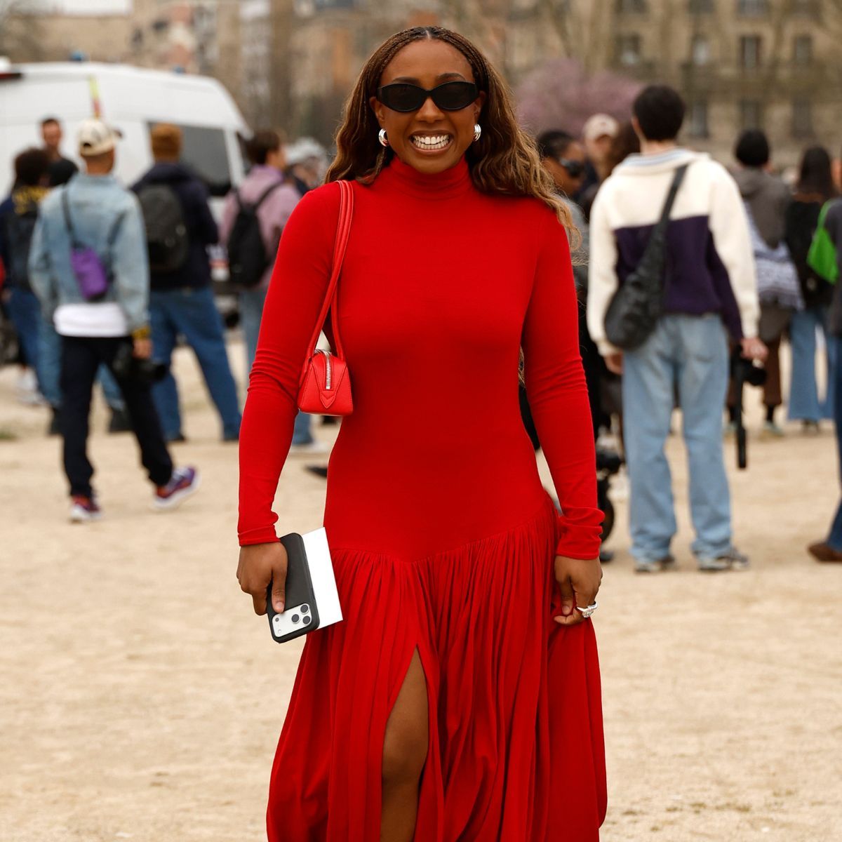 It also doesn't shout quite as loudly as something you might wear in summer. Instead of leopard spots or statement florals, you're more likely to see stripes or subtle paisley in spring. That's not to say you have to stick to neutrals, however. The Cut's Lindsay Peoples chose a tomato red turtleneck dress for Loewe, which, incidentally, coincided with one greyer day in Paris—and lifted the mood on the streets in absence of sun. Another approach is a sleeveless knitted dress that's light enough for double digits—and can be accessorised accordingly.