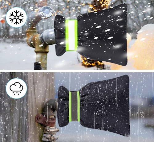 When temperatures drop, your outdoor irrigation system takes a hit. This faucet cover protects the most important touch points from the cold, wind, and wet of winter. It is easy to deploy. Just snug it over the faucet and wrap it closed. It keeps snow, ice, and water off the faucet and insulates it against the cold to prevent freezing. It comes in two colors. This is a pack of two.