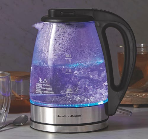 Amazon -Does a watched pot ever boil? You can see for yourself with this electric kettle that lets you see the water make its physical transformation from cold to boiling. It makes that transition very quickly in this borosilicate glass pitcher. Measures printed on the side help you boil precise quantities, and it shuts off automatically when the water is hot. It comes in two colors.
