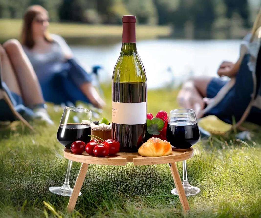 Designed for outdoor use, this compact folding picnic table provides a stable surface for drinks and small snacks on grass, sand, or patio pavers. Built-in slots help keep stemware upright, and the grooved tray keeps fruit, nuts, and snacks from sliding around. The collapsible, portable design is perfect for picnics, camping, beach days, and backyard setups.