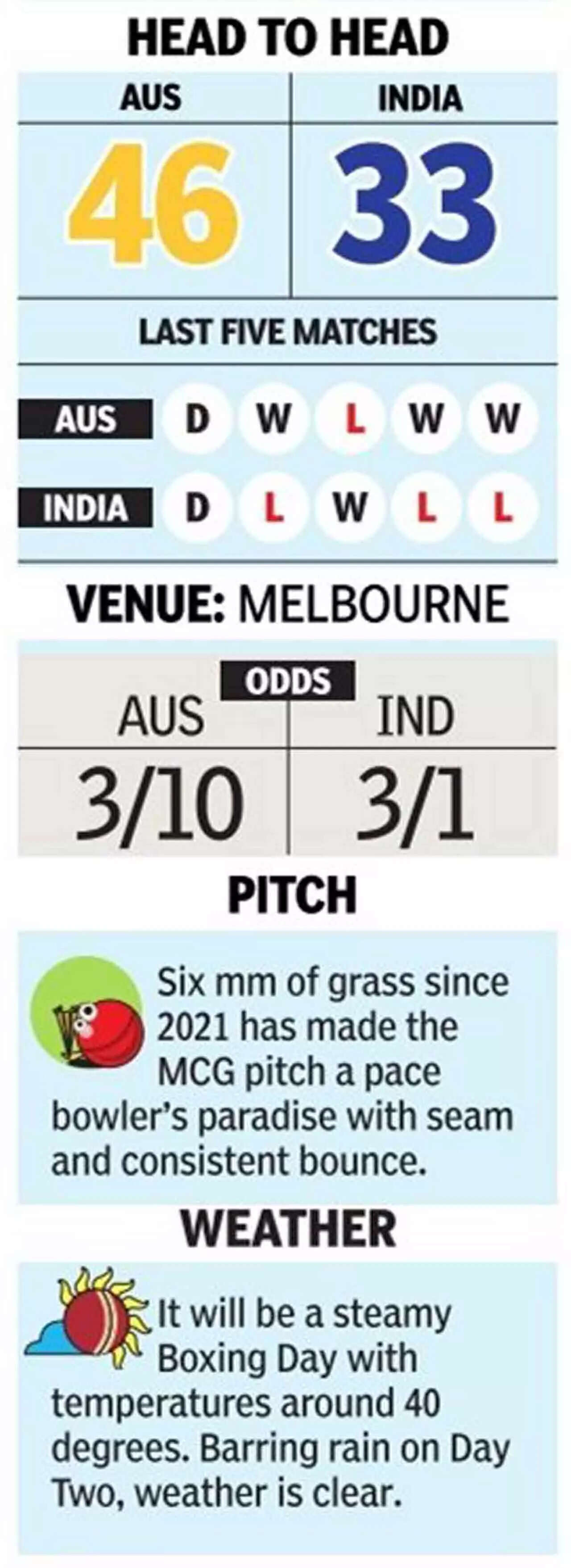 India are attempting to become the first and only team since England in 1885 to win three consecutive Tests at the MCG. Victory will ensure they will at least retain the Border-Gavaskar Trophy, no matter what happens in the last game in Sydney. It will also keep their World Test Championship hopes alive and may earn some declining batting wizards a temporary breather.